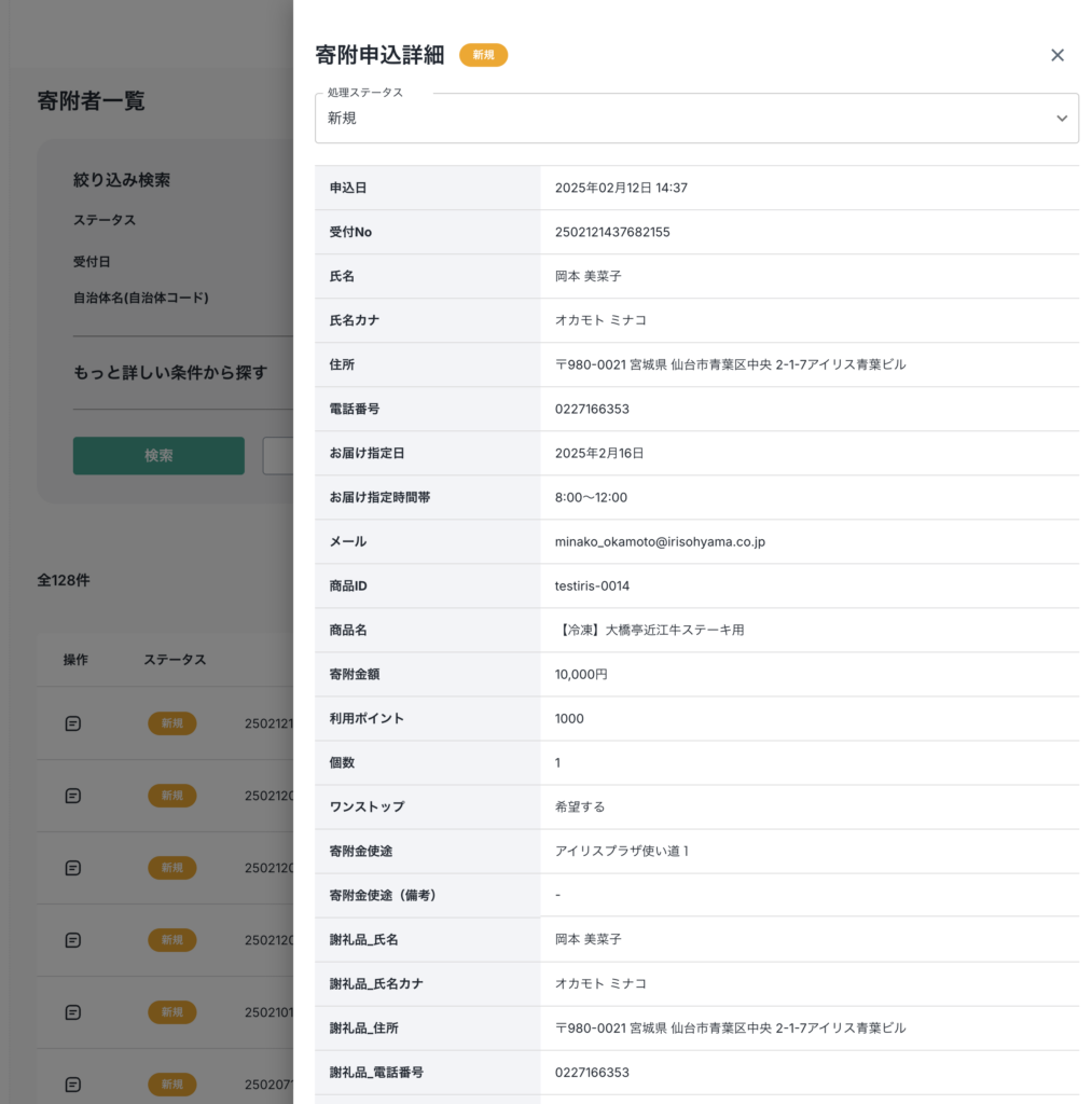 操作にあるアイコンをクリックすると寄附情報の詳細が表示されます。(自治体、中間事業者権限のみ可能)