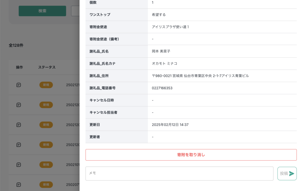 また、各寄附情報にメモを記入することが可能です。