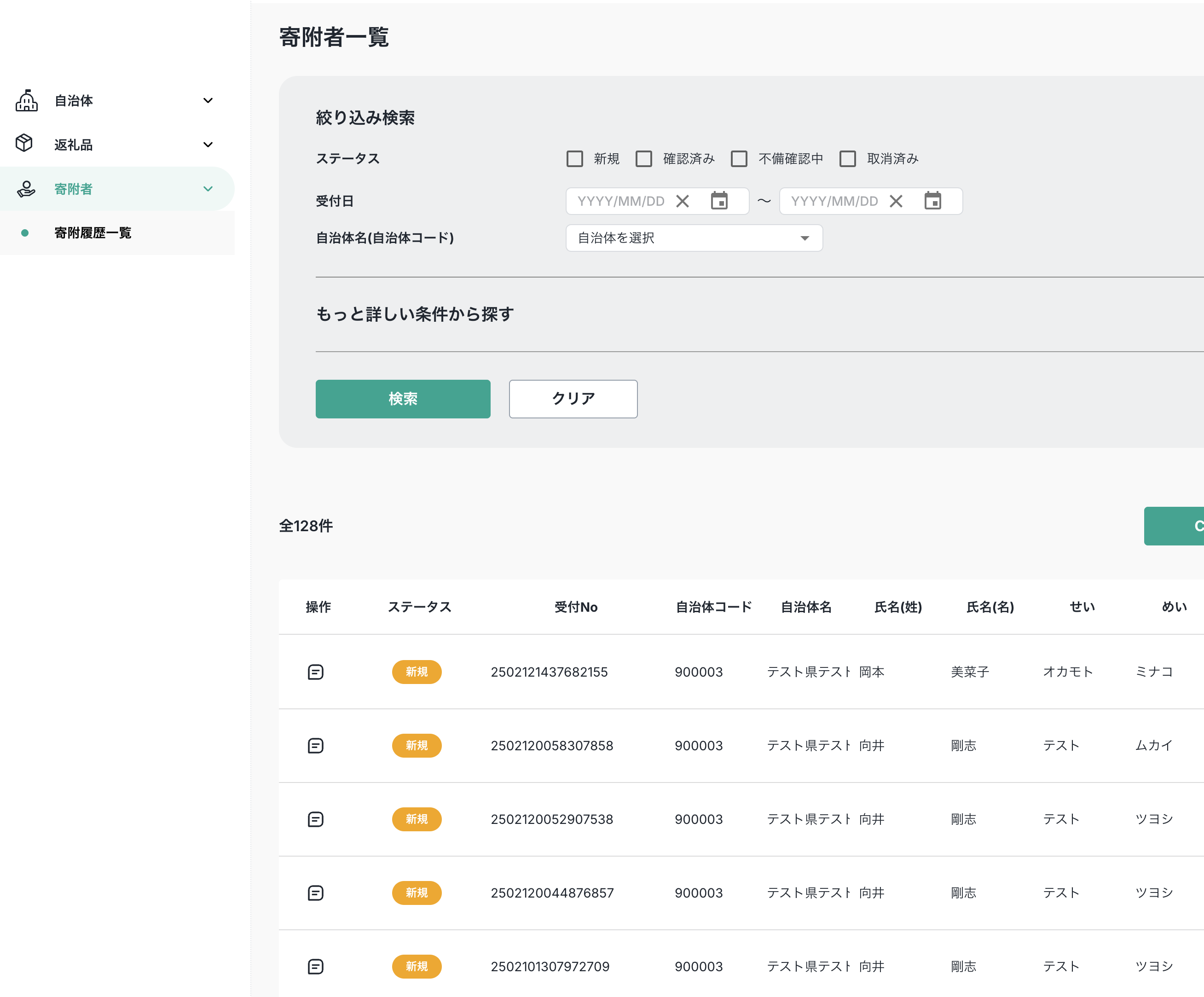 左サイドメニューにある「寄附者」→「寄附履歴一覧」からアクセスします。