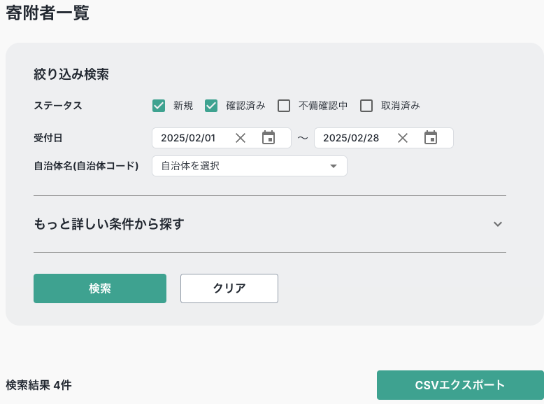 寄附履歴CSVエクスポートは、寄附者が寄附をしたデータ群をCSVにてエクスポートできる機能になります。