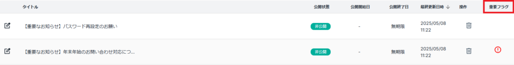 また、お知らせ一覧に掲示されている場合には、お知らせタイトルの横に重要アイコンが表示されます。