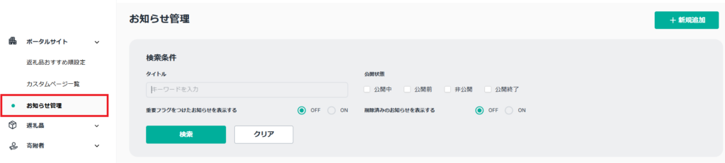 管理画面の「ポータルサイト」メニュー内にある、「お知らせ管理」からポータルサイトに掲示するお知らせの内容や公開期間を編集することができ、公開されたお知らせについては新しい順で表示されます。