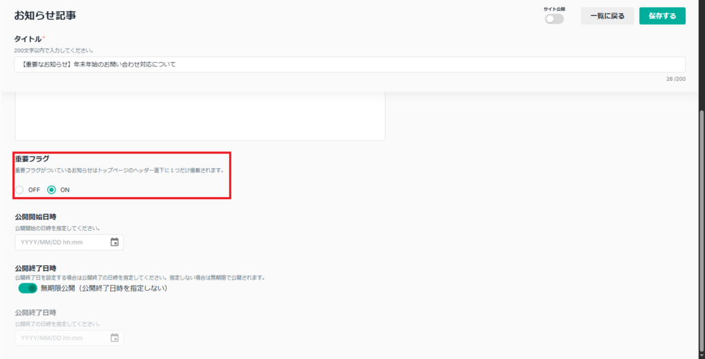 ※重要フラグがONであっても、公開フラグがOFFまたは、公開期間外であれば表示されません。